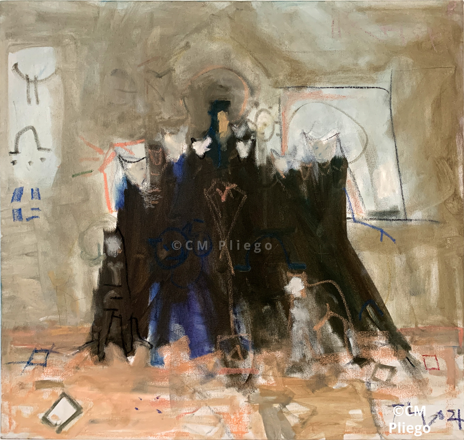 Expressionist dream-like painting by CM Pliego showing different figures of cats. mixed media on canvas
