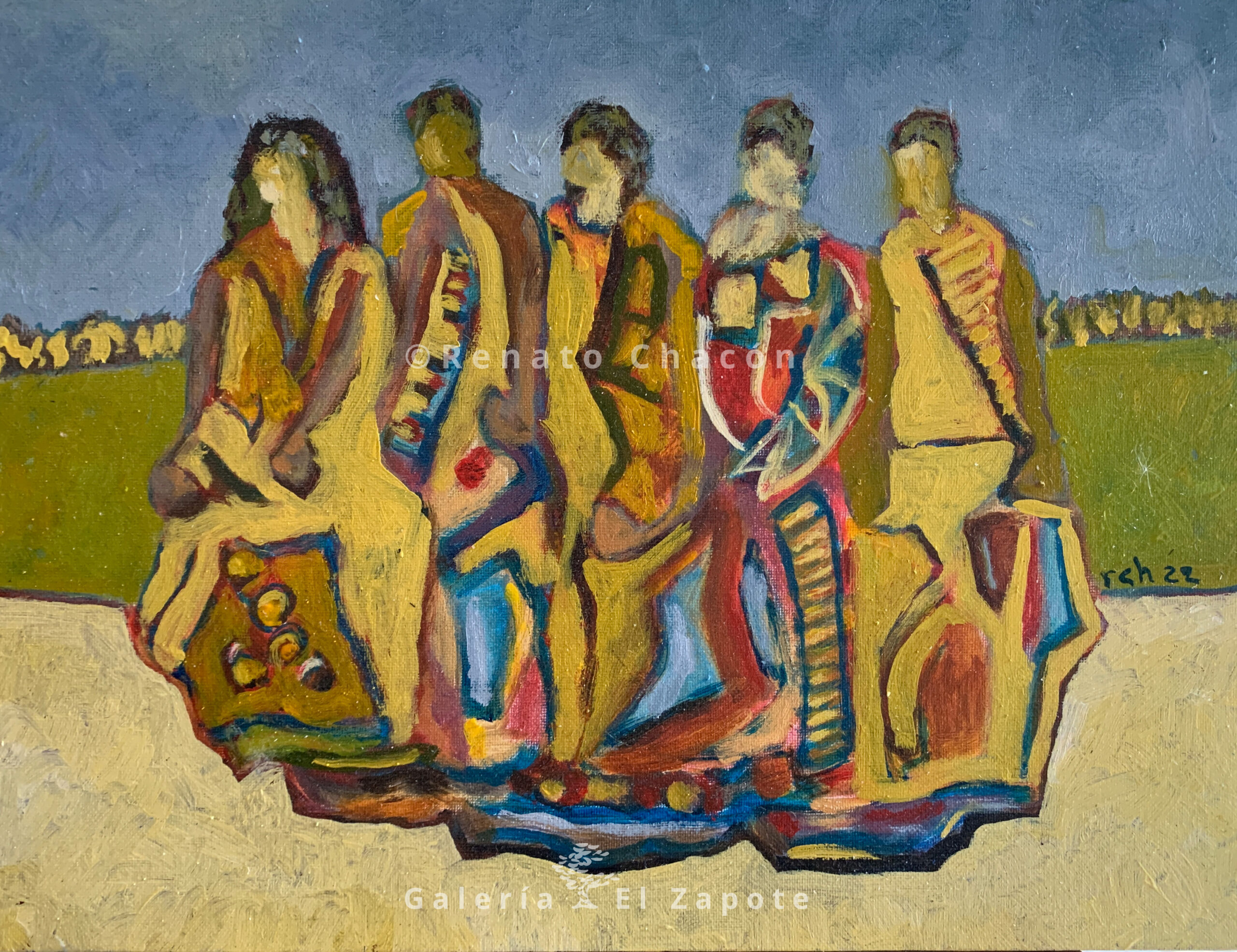 Mis fantasmas me siguen | Renato Chacón’s painting depicting a group of 5 people, a family, an abstraction.