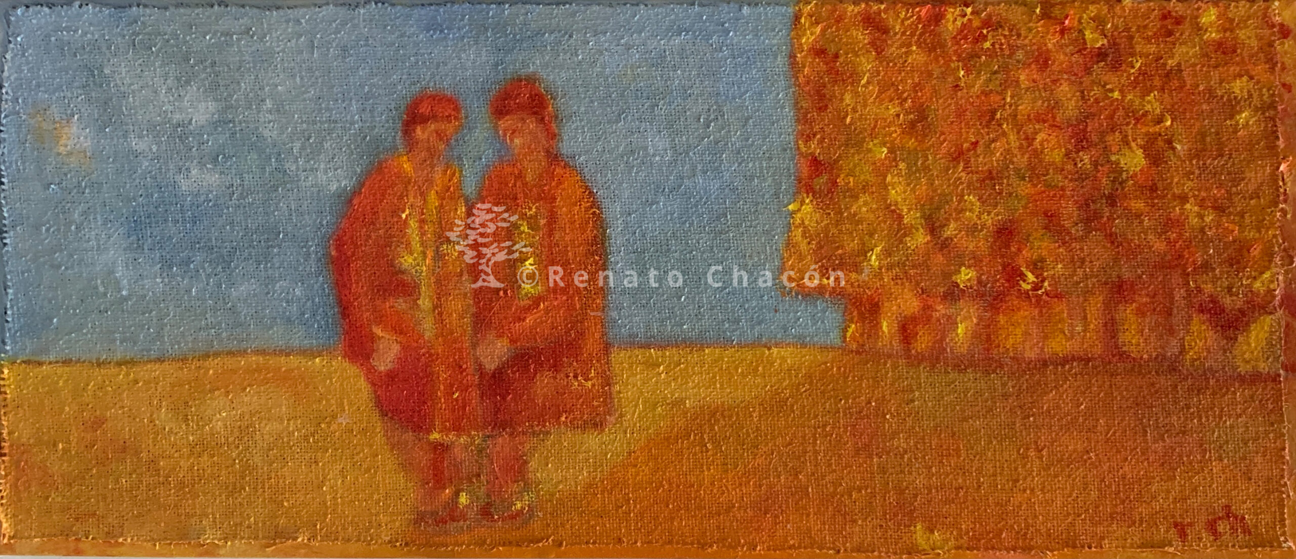 Additional artwork information: “Al lado de los cipreses” is from El Zapote Gallery selection of Renato Chacon’s figurative life painting, a series of paintings on burlap, artwork showing a couple in a landscape with cypress trees, we believe you are going to love it, think about having it on your own private collection.