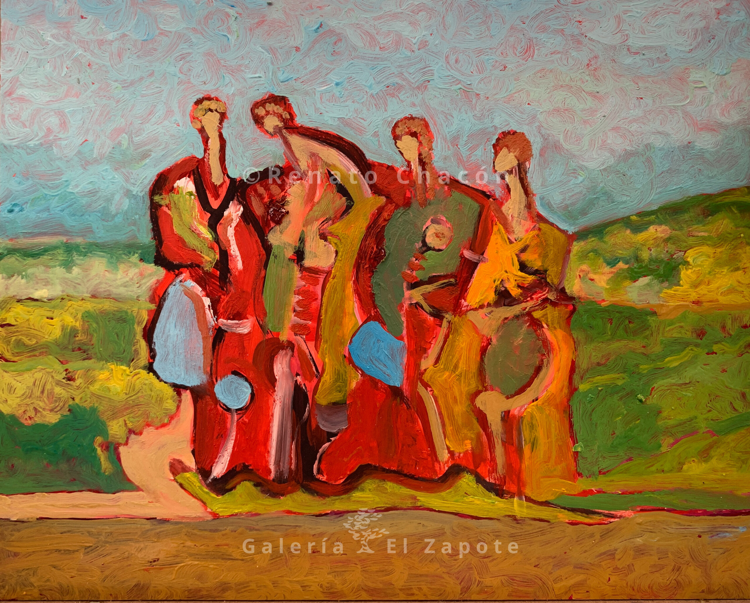 Reagruparse y seguir | Renato Chacón’s painting depicting a landscape, and a group of women.