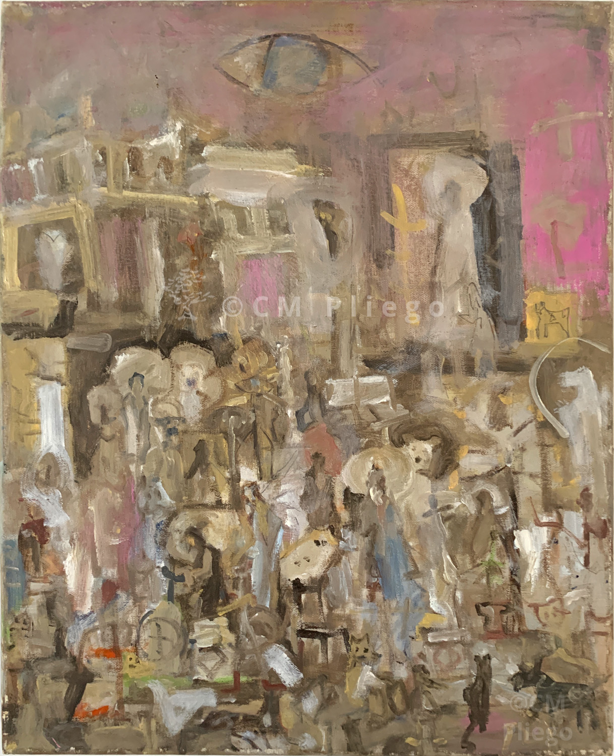 Expressionist dream-like painting by CM Pliego showing a city scenery including dogs and other hidden characters. mixed media on canvas